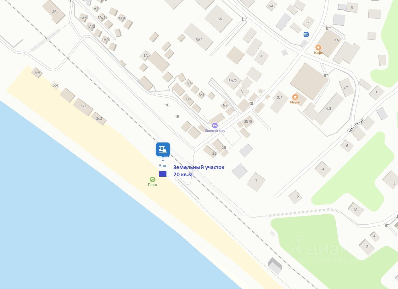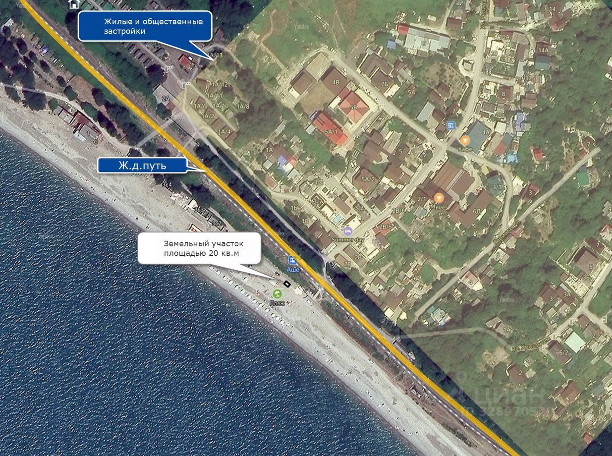 Участок правильной формы. Инженерные коммуникации отсутствуют. Земельный участок расположен в курортной зоне Черноморского побережья на пляже микрорайона Аше, в окружении жилой застройки. Хороший пешеходный трафик. Наличие парковочных мест на прилегающей территории. В шаговой доступности магазины, остановка общественного транспорта и железнодорожная станция Аше. Проезд к участку осуществляется по улице Репина.
