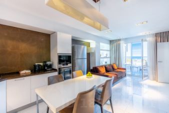 Квартира включает 2 отдельные спальни и гостиную с кухонной зоной, а также открытую лоджию с панорамным видом на море и город.