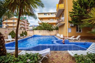 На территории есть б е с п л а т н ы й подогреваемый бассейн с шезлонгами для взрослых и гостей помладше!