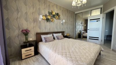 В квартире выполнен свежий элегантный ремонт, основное спальное место кровать 1,8 * 2 м с ортопедическим матрасом, в гостиной двухместный диван. Также имеется вся необходимая бытовая техника, посуда, постельное белье и прочие мелочи для комфортного проживания.