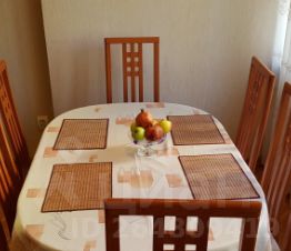 В зоне отдыха располагается большой обеденный стол с 6-ю стульями, два кресла и раскладной двуспальный диван-кровать. В первой спальной комнате расположена большая двуспальная кровать, раскладной спальный одноместный диванчик, высокий платяной шкаф, два комода и прикроватная тумба. Во второй спальной комнате имеется большой раскладной двуспальный диван, письменный стол со стулом и два больших шкафа (платяной и с полочками). К вашим услугам также утюг, фен, гладильная доска, напольная сушилка для белья. В квартире могут комфортно разместиться до 6 человек. По запросу за дополнительную плату можем доставить и смонтировать детскую кроватку.