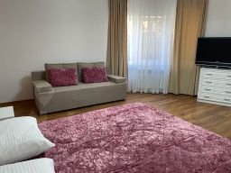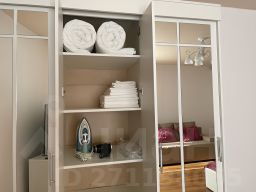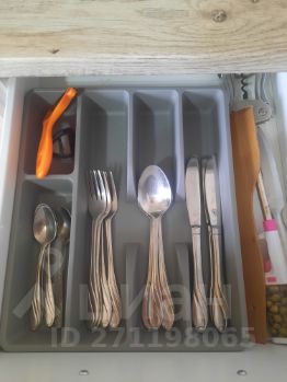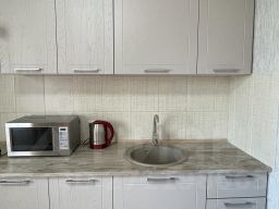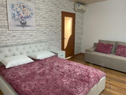 В квартире имеется одна двуспальная кровать и 2-х местный диван-кровать .Полностью оборудованная кухня, кондиционер, телевизор, Wi-Fi, тёплый пол, холодильник, стиральная машина, микроволновка, чайник электрический, вся необходимая посуда, кастрюли, сковородка, утюг, фен, гладильная доска, сушилка для белья .