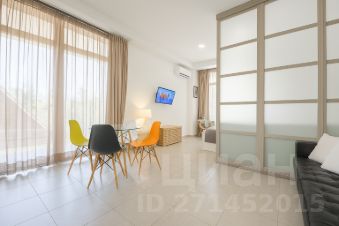 Студия площадью 34 кв.м., расположенная на первом этаже, рассчитана на комфортное размещение до 4 человек с панорамным видом на горы и городские просторы.
