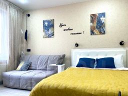Гостей ждет двухспальная кровать с удобным матрасом 140х200 и диван-аккордеон со спальным местом 140х200, благоухающее бельё отельного качества , полотенца двух размеров для каждого гостя, оборудованная миникухня с кухонными принадлежностями, стиральная машинка. В совмещенном санузле с душем есть все средства гигиены. Горячая вода подаётся от общедомового котла, поэтому никто не страдает от временного отключения от сетей города.