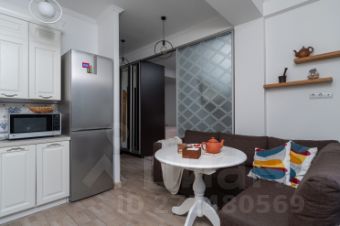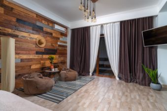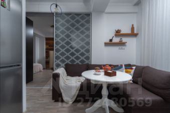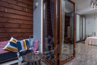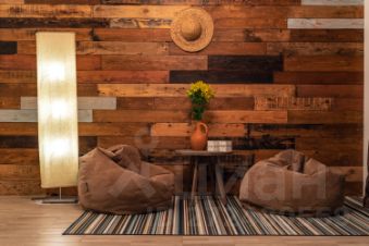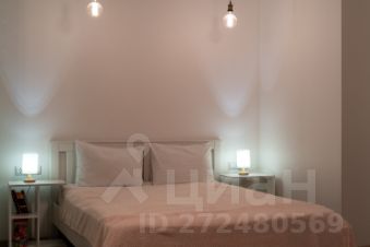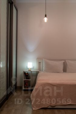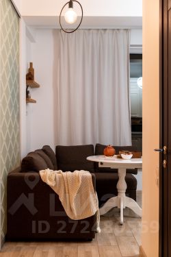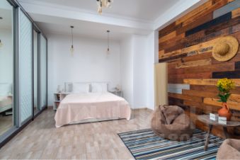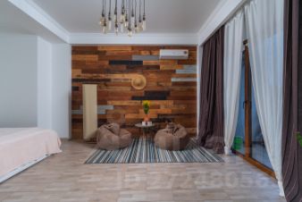 В данной квартире создана уютная атмосфера, сочетающая стильное оформление и функциональность. Спальная зона оборудована комфортной двуспальной кроватью, рядом находятся мягкие кресла-мешки для отдыха. Оригинальная деревянная панель на стене придаёт помещению тепло и индивидуальный характер. Гостиная зона включает удобный диван (раскладывается в двуспальную кровать) и круглый стол, идеально подходящий для завтраков или уютных вечеров. Кухня оснащена современной техникой, что позволяет приготовить полноценный обед или ужин.