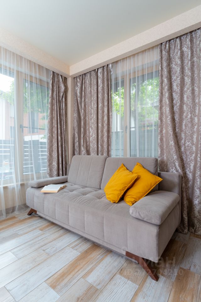 Зона отдыха оформлена со вкусом — мягкий диван, украшенный яркими подушками, становится идеальным местом для расслабления с книгой или просмотра телевизора.