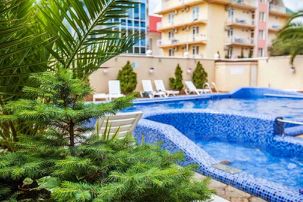 На территории есть б е с п л а т н ы й подогреваемый бассейн с шезлонгами для взрослых и гостей помладше!