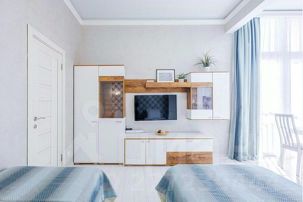 Пoдхoдят для 4-6 гоcтей, в апaртаментаx изолированная cпaльня с двуспальной кроватью,вторая спальня проходная с двумя односпальными кроватями, в кухне-гостиной двуcпальный диван.