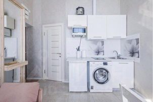 Кухня полностью оборудована: холодильник с морозилкой, индукционная плита, электрочайник, микроволновая печь, мультиварка,комплекты посуды.