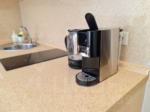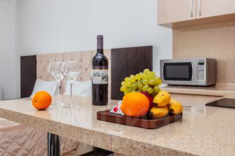 Сам апартамент оснащён всем необходимым для проживания, как на короткий, так и длительный срок. В отличии от других подобных апартаментов, имеется полноценная кухня со всеми кухонными принадлежностями. Так же в номере имеется стиральная машина, СВЧ печь (микроволновка), утюг, гладильная доска и сушилка, фен, кондиционер, телевизор с плоским экраном и спутниковыми каналами, безплатный интернет. Немаловажно знать, то что апартамент шумоизолирован и шума с улицы, при закрытых окнах не слышно.