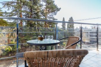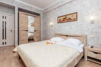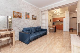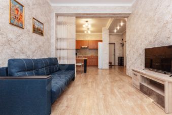 В квартире отдельная спальня с большой кроватью и выходом на балкон и просторная совмещённая кухня-гостиная с раскладывающимся диваном (также выход на балкон).
