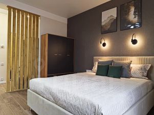 Мягкая кровать. Удобный диван. Уютная кухня. Красивый вид