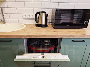 На кухне полная комплектация для приготовления еды. Плита газовая, микроволновая печь, электрический чайник, холодильник с морозильной камерой, посудомойка. Современная красивая посуда, бокалы, кружки, приборы и кухонные принадлежности. Обеденный стол рядом с окном