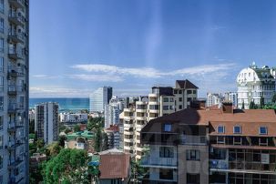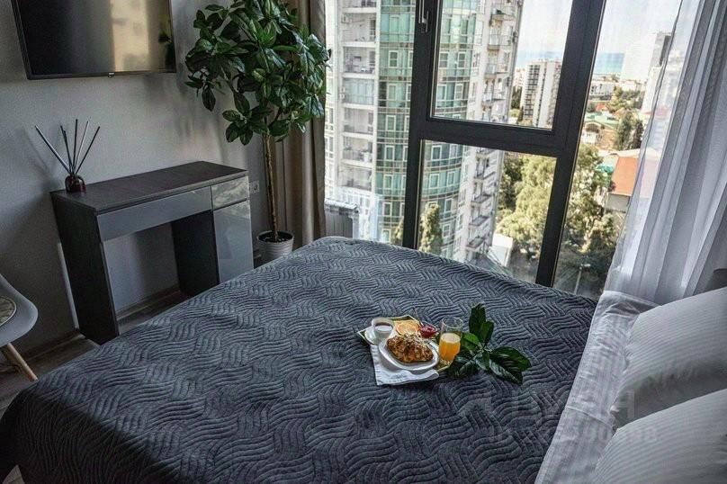 ОПИСАНИЕ АПАРТАМЕНТА: Новая стильная студия с повышенным уровнем сервиса в центре Сочи. Вас ждет панорамное остекление с видом на море. Двуспальная кровать (King Size, матрас Аскона), белоснежное постельное белье как в дорогом отеле, гостевые наборы (шампунь, гель /душа, полотенца, пледы и др.). Оснащенная кухня, техника, идеальная чистота и супер-комфорт.