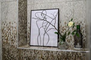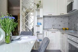 Кухонная зона полностью укомплектована: чайник, столовые приборы и посуда, электрическая плита, духовой шкаф, посудомоечная машина и микроволновая печь.