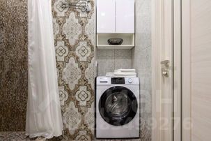 Санузел с душевой кабиной, раковиной с зеркалом, унитазом и стиральной машиной.