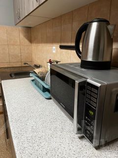 На кухне : диван, плита , холодильник , микроволновая печь , посуда .