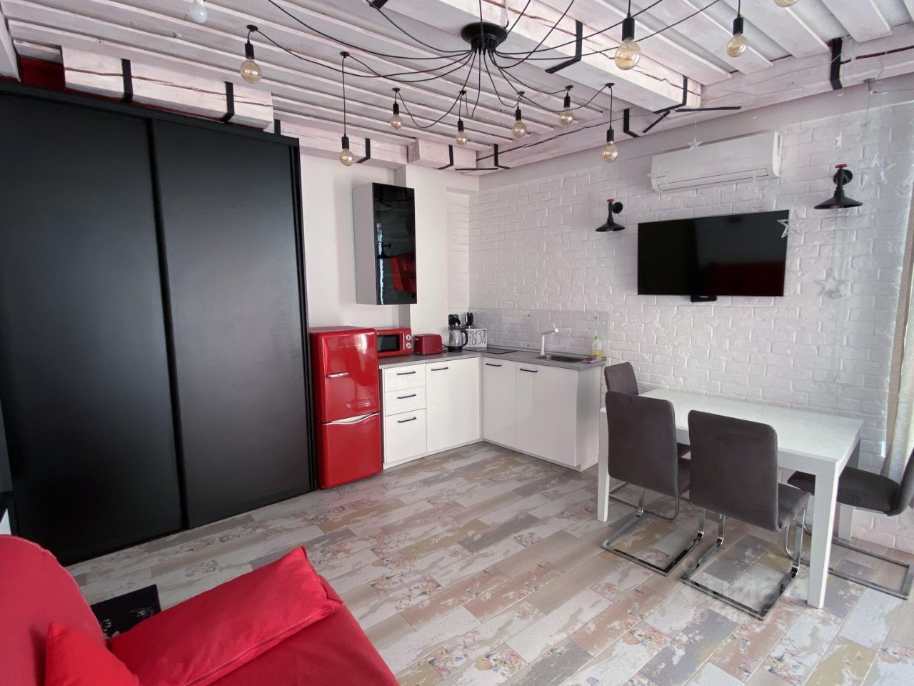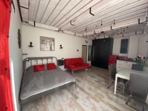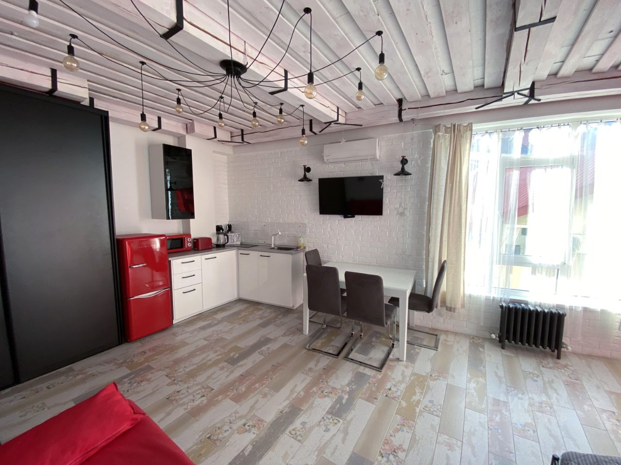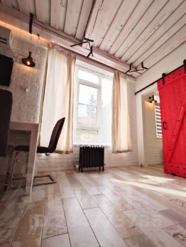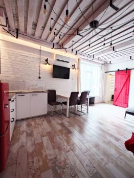 Студия в стиле лофт - это 4 спальных места (двуспальная кровать и раскладной двуспальный диван ikea+ при необходимости раскладушка. Ванная комната со всеми удобствами- очень большая, огромная душевая. На стене НЕ БОЙЛЕР, а совремннная настенная стиральная машина DAEWOO с функцией сушки.