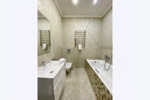 В квартире просторная ванная комната, кухня оснащена плитой, посудой необходимой для приготовления пищи.