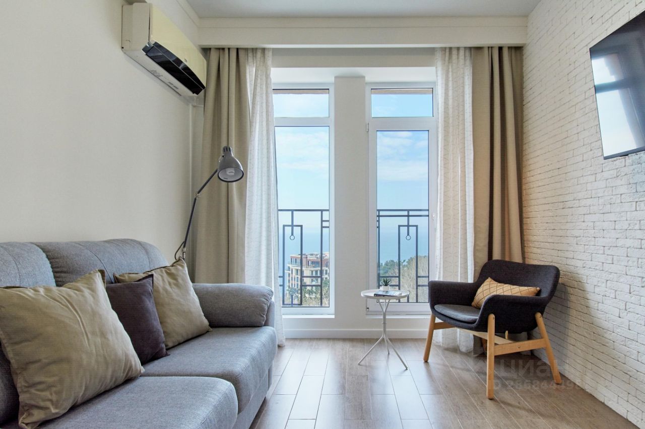 Панорамные окна гостиной и спальни выходят на море. В квартире нет балкона, но окна в пол компенсируют его отсутствие. Рядом с домом находится магазин К&Б, кулинария и магазин овощи-фрукты. Ближайшие остановки и аптеки находятся в 7-ми и 15 минутах ходьбы.
