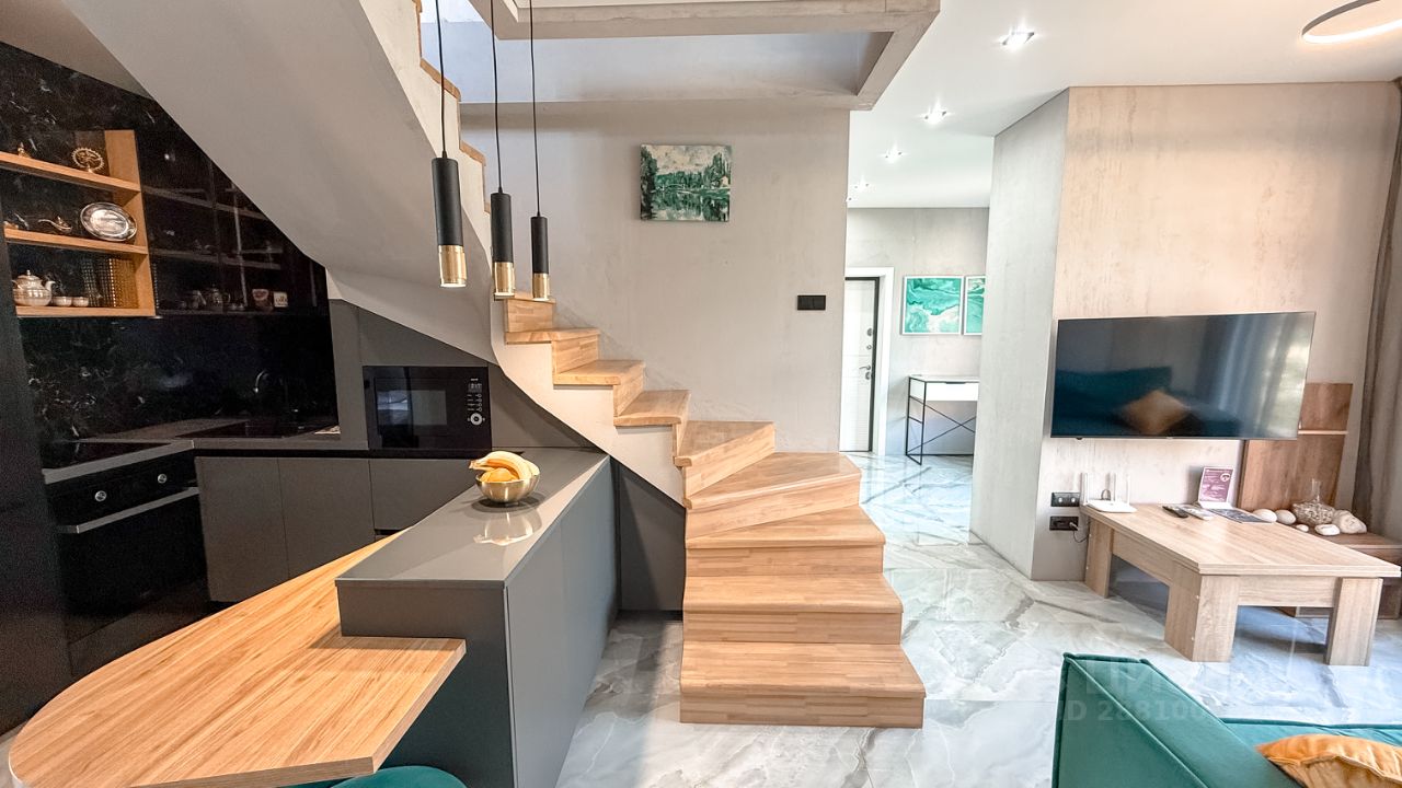 Дизайнерские aпаpтaмeнты с 3 изолированными спальнями, кухнeй-гocтинoй и собственной террасой 50м2. Рacположeны на 3 этажe в доме без лифта.