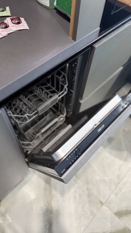 Кухня-гостиная: двуспальный диван, ТВ, кухня, барная стойка, холодильник, посудомоечная машина, духовой шкаф, набор посуды для приготовления и приема пищи.