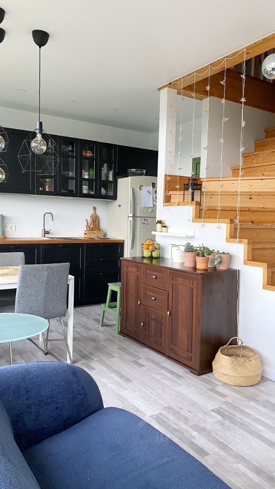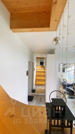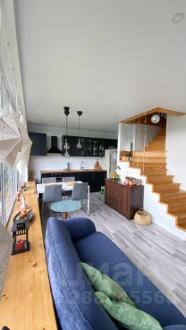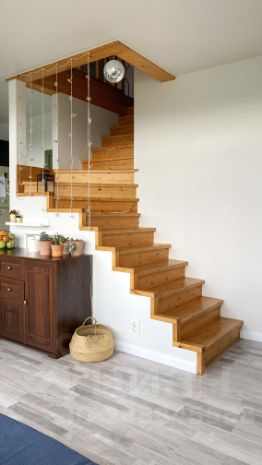 На первом этаже кухня-гостинная, балкон, большой сан.узел с ванной.