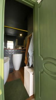 В ванной французская сантехника, итальянский керамогранит, большая угловая ванная, зеркало на всю стену. Стир.машинка.
