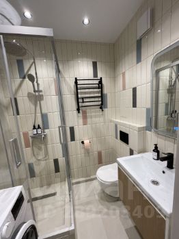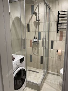 Ванная комната: душ, инсталляция, раковина с тумбой, стиральная машина, водонагреватель, фен.