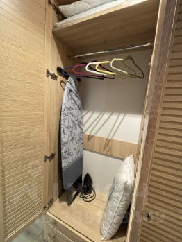 В студии также есть кондиционер, большой шкаф с полками, ящиками, вешалками.