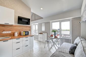 • Кухня: кухонный уголок, духовой шкаф, микроволновка, варочная панель, холодильник, обеденная зона;