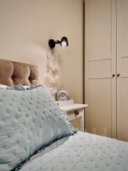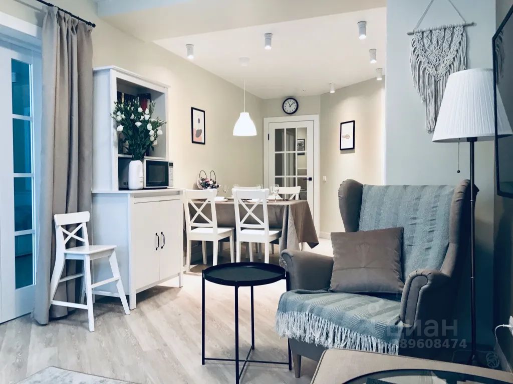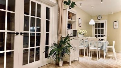 Стиль хюгге в апартаментах подразумевает домашнюю комфортную обстановку, лёгкость и естественность. Апартаменты максимально располагают к расслаблению, ощущению безопасности и уюта. Главной изюминкой апартаментов являются белые распашные прозрачные двери в гостиной, создающие атмосферу единого большого пространства и свободы передвижения. Для создания приватности двери могут быть закрыты и зашторены.