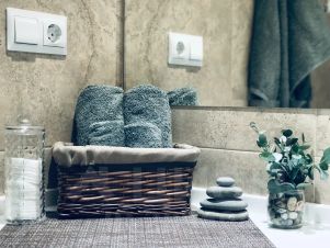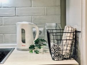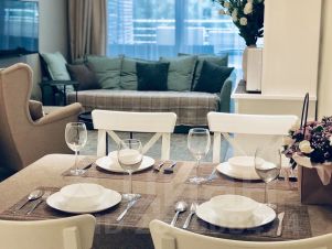 В апартаментах продуманы все детали для комфортного проживания самых взыскательных гостей, имеется необходимая мебель и бытовая техника. Кухня полностью оснащена всем необходимым оборудованием, принадлежностями и столовыми приборами, имеется посудомоечная машина, кофемашина, система очистки воды. В каждой комнате установлены кондиционеры. Санузел имеет пол с подогревом. В апартаментах подведен высокоскоростной интернет. Есть электрический бойлер на случай отключения горячей воды. Все комнаты оснащены шторами blackout с максимальным затемнением для комфортного сна, а белоснежное постельное бельё из сатина никого не оставит равнодушным.