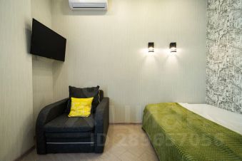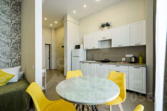 Студия с акцентами из яркой мебели на кухне лимонного цвета, что придает ещё больше красок и сочности интерьеру.