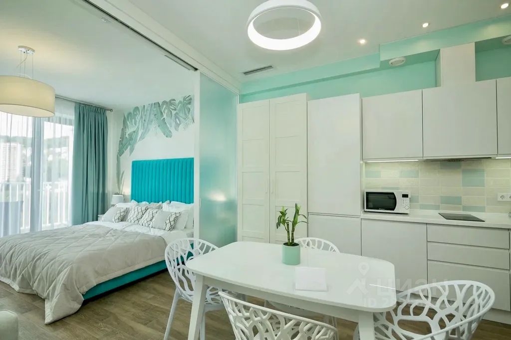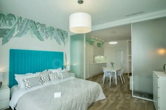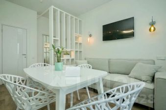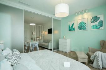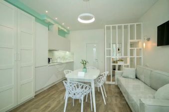 Спальная зона по вашему желанию может быть изолированной комнатой. Новый ремонт! Оборудованная всей бытовой техникой. В апартаменте есть все для комфортного отдыха!