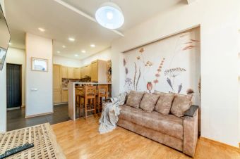 В гостиной удобный раскладной диван на 2 спальных места, кресло-кровать, ТВ-зона.