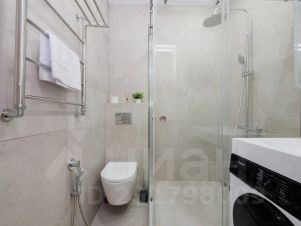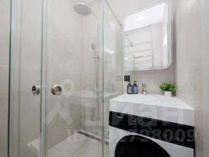 Санузел оснащен раковиной с зеркалом, душевой кабиной, унитазом и гигиеническим душем.