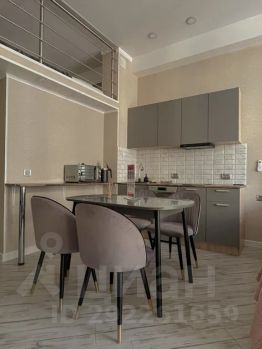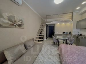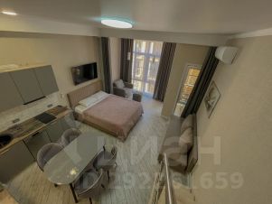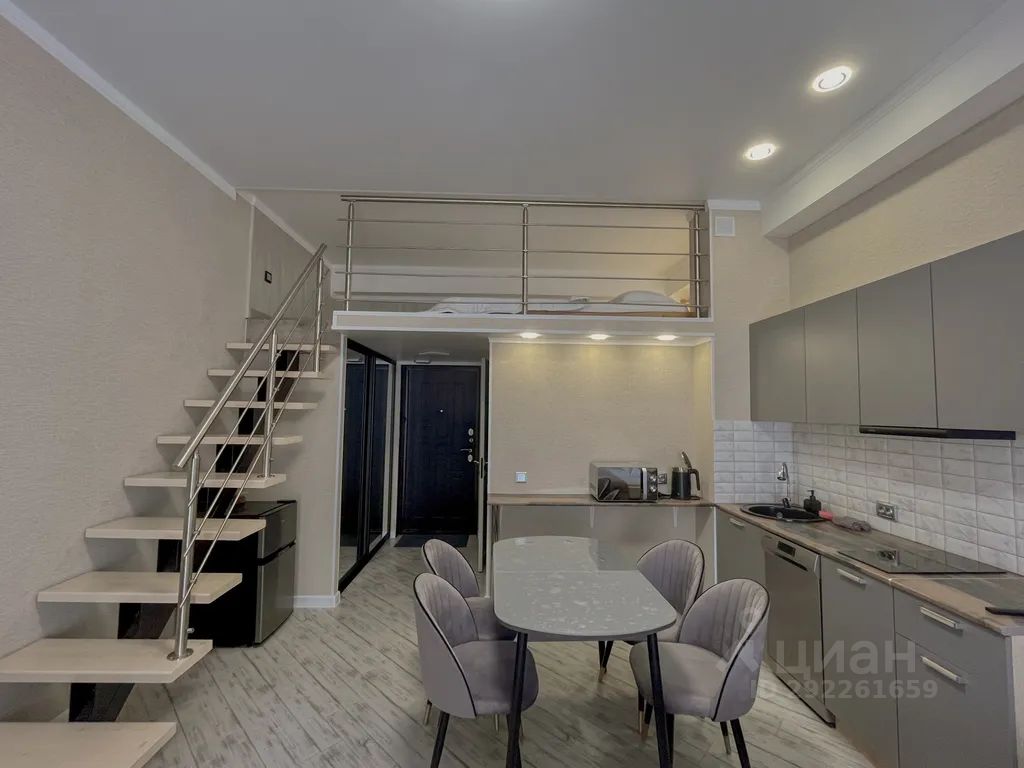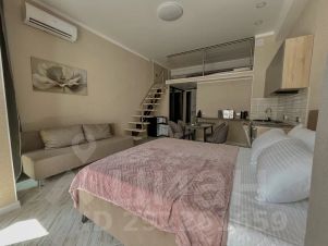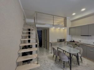 Квартира-студия выполнена в двух уровнях. На первом этаже располагается кухня-гостиная, приватная зона отдыха с удобным креслом, ванная комната с тропическим душем, шкаф-купе. Основные спальные места- кровать (160х200) и раскладной диван(140х200).
