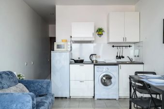 Есть всё необходимое для комфортного отдыха двуспальный диван кровать, шкаф, кондиционер, кресло-кровать, кухонный уголок, электроплита, холодильник, микроволновая печь, чайник, посуда, стол, стулья, телевизор, совмещённый санузел с душевой, стиральная машинка, утюг, гладильная доска, фен, постельное бельё, полотенца, интернет, кабельное телевидение