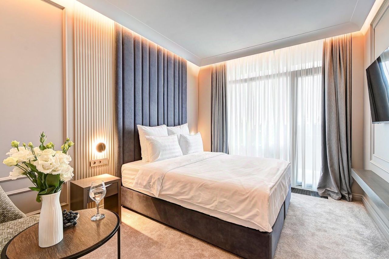 - В номере: мини-холодильник, чайная станция, фильтр для воды, сейф, халаты и тапочки, зубной набор, фен, ручной отпариватель, телевизор со SmartTV, Wi-Fi, шторы блэкаут, кондиционер.