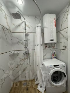 В ванной комнате стиральная машина, зеркало, средства гигиены.