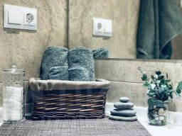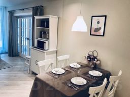 Апартаменты двухуровневые с тремя комнатами общей площадью 94,5 кв. м. На 1 уровне располагаются входная зона и прихожая, на 2 — санузел, просторная кухня-гостиная с выходом на собственную террасу с видом на горы, 2 изолированные спальни, одна из которых также выходит на террасу. Есть компьютерный стол и стул для удаленной работы. Все комнаты оснащены шторами Blackout с максимальным затемнением для комфортного сна.