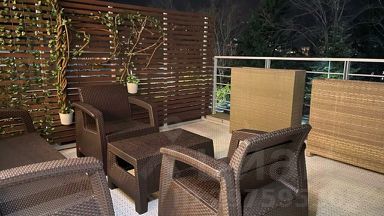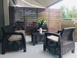 Просторная терраса площадью 23 кв. м. с видом на горы и парк оборудована полным комплектом удобной уличной мебели. Напольное теплое покрытие на террасе позволяет чувствовать себя комфортно даже босиком.