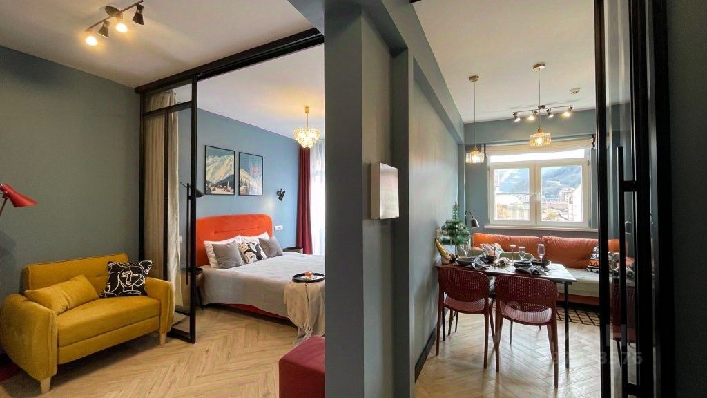 Апартаменты подходят для размещения 5 гостей. Возможно размещение с домашними животными за дополнительную плату. В распоряжении гостей: кофемашина, мини-библиотека, Wi-Fi и Смарт-ТВ, персональные мягкие крепления для лыж и сноуборда.