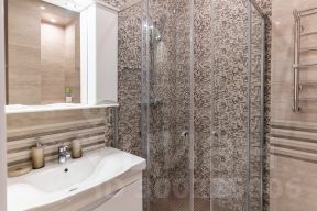 Ванная комната оснащена всем необходимым, включая душевую кабину, полотенцесушитель, раковину и зеркало