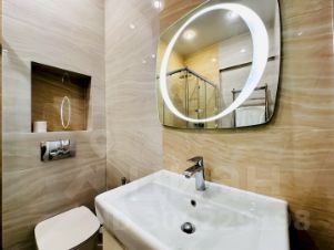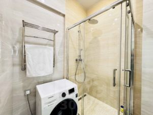 Ванная комната оснащена всем необходимым, включая душевую кабину, полотенцесушитель, раковину и зеркало