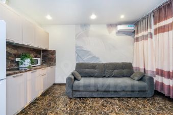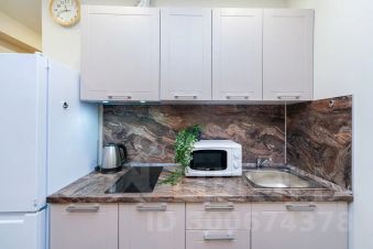 3. Оборудованная кухня в современном стиле: холодильник, встраиваемая варочная панель, встраиваемая вытяжка, микроволновая печь, чайник, посуда для приготовления, столовая посуда и приборы, кухонные принадлежности.