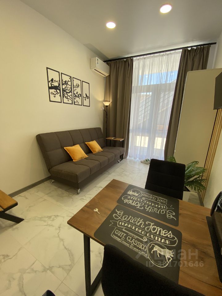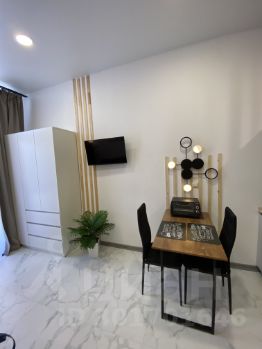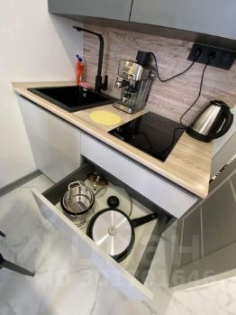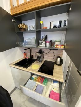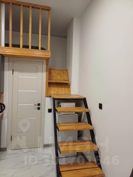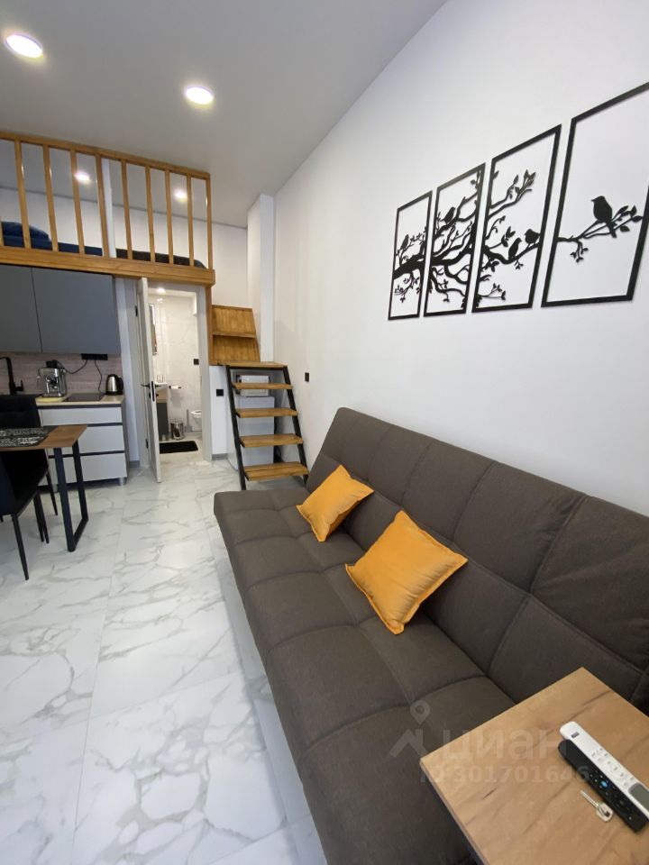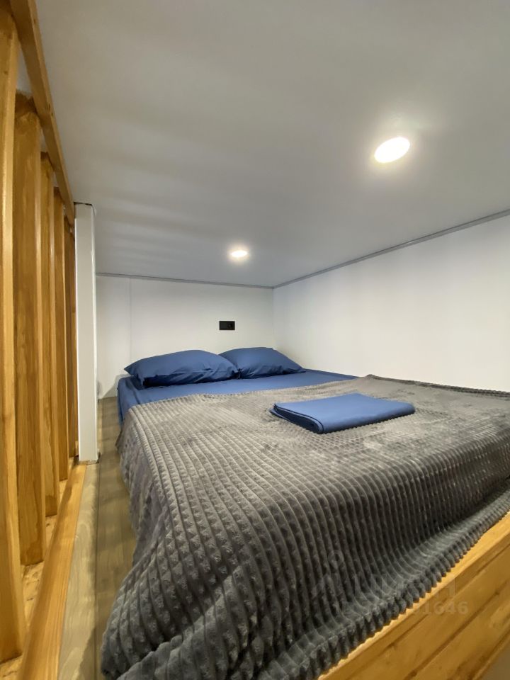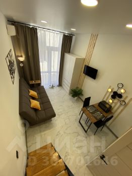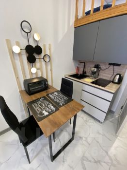 приятный и функциональный дизайн квартиры в двух уровнях . первый уровень студия ,совмещенная с кухонной зоной ,второй уровень- спальное место на двоих .