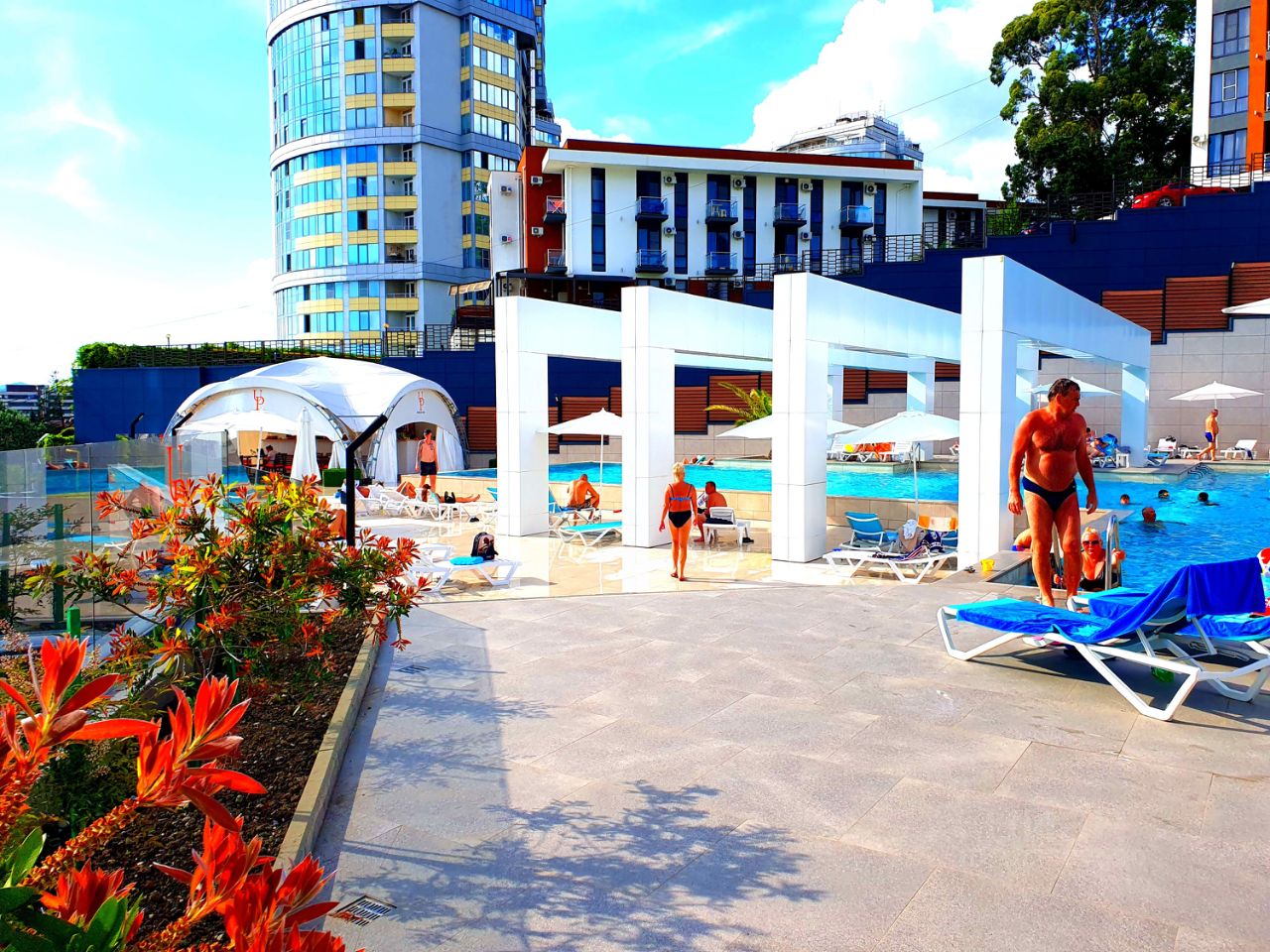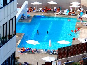 Бассейн 25 на 25 м., туалеты душевые, раздевалки, бар, бесплатные шезлонги.