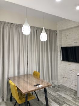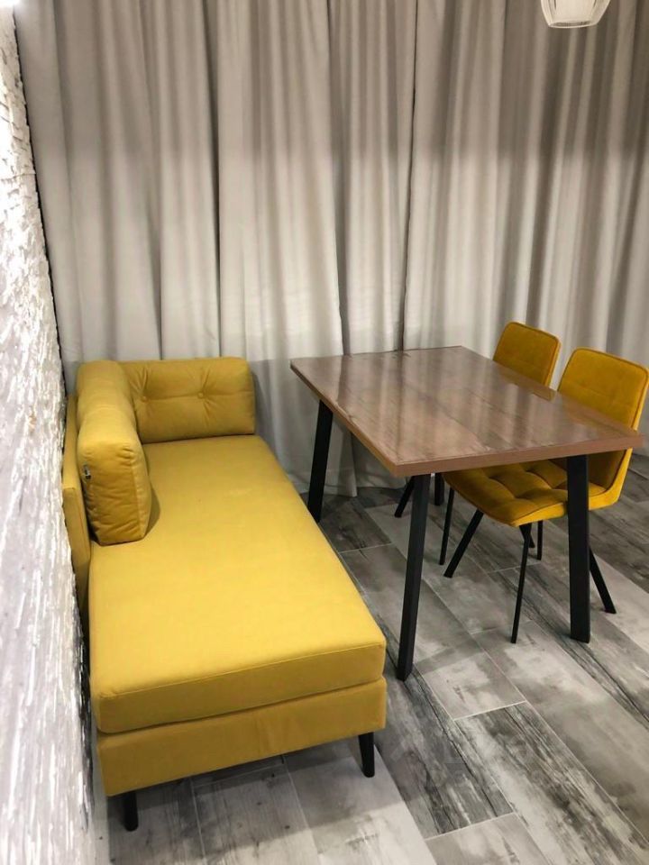 На кухне есть вся необходимая посуда, встроенная техника (плита, холодильник, духовой шкаф с функцией СВЧ), кондиционер, большой телевизор, кушетка не раскладывается.